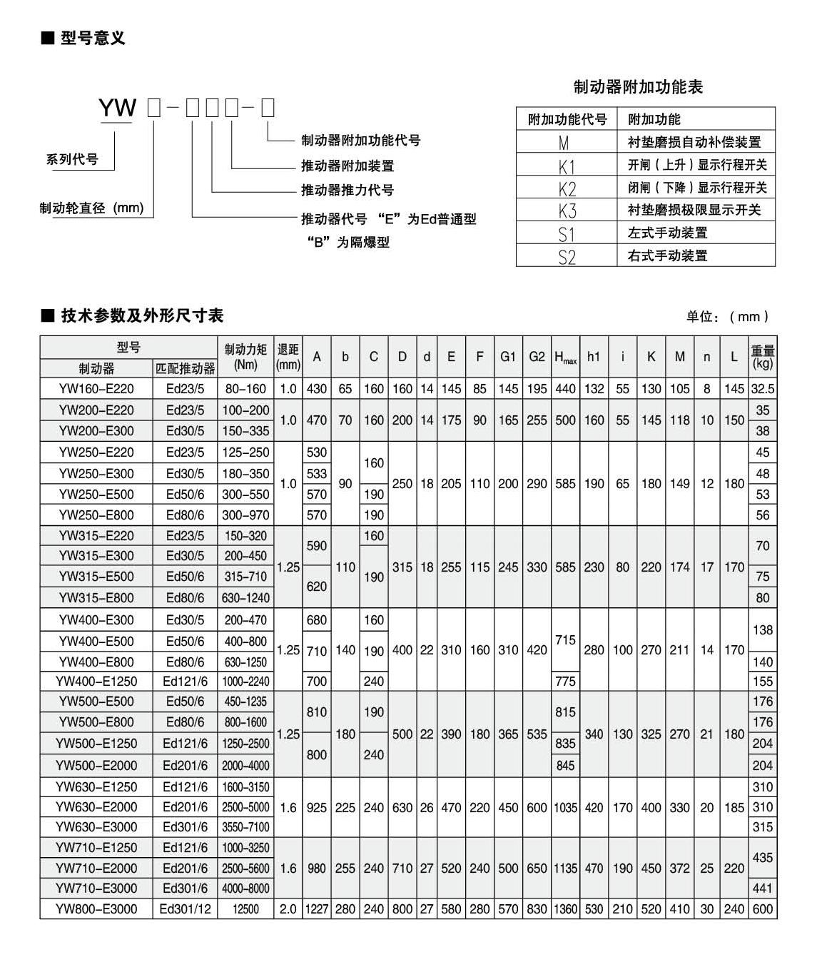 應(yīng)用:YW,YWZ13系列電力液壓鼓式制動器,廣泛應(yīng)用于有防爆要求的各種起重運輸、皮帶運輸、港口裝卸、冶金及建筑機械中各種機構(gòu)的減速和停車(維持)制動。符合標(biāo)準(zhǔn):YW,YWZ13系列電力液壓鼓式制動器的連接尺寸和技術(shù)要求符合JB / T6406-2006標(biāo)準(zhǔn);制動力矩參數(shù)符合DIN15435標(biāo)準(zhǔn),配套符合DIN15430標(biāo)準(zhǔn)的Ed系列推動器。主要特點:▲ 聯(lián)鎖式退距均等裝置和瓦塊自動隨位裝置,可始終保持兩側(cè)瓦塊退距均等且無需調(diào)整,完全避免因退距不均使一側(cè)制動襯墊浮貼制動輪的現(xiàn)象;▲ 主要擺動鉸點均設(shè)有自潤滑軸承,傳動效率高,壽命長,使用中無需潤滑;▲ 制動彈簧在方管內(nèi)布置并設(shè)有標(biāo)尺,用戶可十分方便地讀出制動力矩值,免去測量和計算的麻煩;▲ 制動襯墊為卡裝式整體成型結(jié)構(gòu),更換十分方便、快捷,備有半金屬(無石棉)硬質(zhì)和半硬質(zhì),軟質(zhì)(無石棉)等不同材質(zhì)的制動襯墊供用戶選擇;▲ 配套Ed系列電力液壓推動器產(chǎn)品,動作靈敏、使用壽命長;▲ 常閉式設(shè)計,(斷電)彈簧制動,(通電)推動器釋放。工作條件:◆ 海拔高度:<2000m;◆ 環(huán)境溫度:-20°C?+ 40°C;◆ 相對濕度:≤90%;◆ 工作制:間歇性(S3-60%)和連續(xù)(S1);◆ 電源電壓:三相交流,AC380 50Hz (其他電源等級可按需要定制);◆ 有特殊要求時在訂貨時協(xié)商確定?;緟?shù):● 產(chǎn)品型號:YW-160、YW-200、YW-250、YW-315、YW-400、YW-500、YW-630、YW-710、YW-800● 適用輪徑:160~800mm● 制動力矩:80~12500Nm● 產(chǎn)品型號:YWZ13-200、YWZ13-250、YWZ13-315、YWZ13-400、YWZ13-500、YWZ13-630、YWZ13-710、YWZ13-800● 適用輪徑:200~800mm● 制動力矩:80~12500Nm