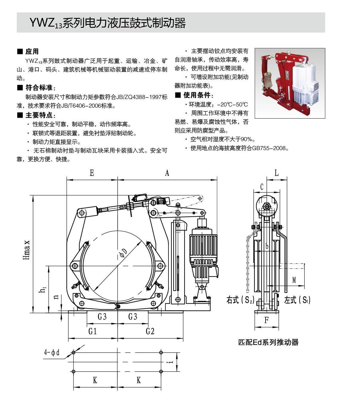 YW,YWZ13系列電力液壓鼓式制動器的連接尺寸和技術(shù)要求符合JB / T6406-2006標(biāo)準(zhǔn);制動力矩參數(shù)符合DIN15435標(biāo)準(zhǔn),配套符合DIN15430標(biāo)準(zhǔn)的Ed系列推動器。