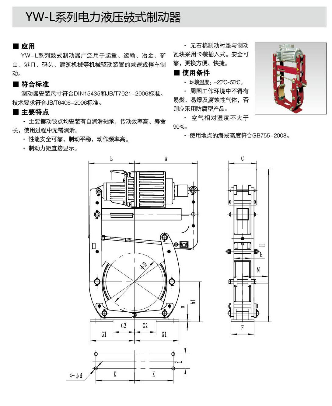 YW-L系列制動器連接尺寸及制動力矩參數(shù)符合JB/T6406-2006標(biāo)準(zhǔn)和DIN15435標(biāo)準(zhǔn)。配套符合DIN15430標(biāo)準(zhǔn)的Ed系列推動器。