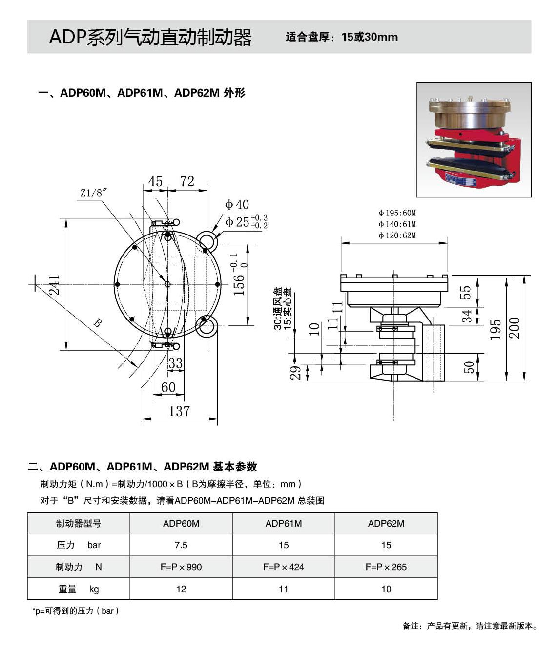 應(yīng)用:ADP 系列氣動盤式制動器,廣泛應(yīng)用于中小型驅(qū)動機構(gòu)的停車制動或減速制動。卷繞機構(gòu)的張緊制動,如造紙廠卷紙張緊、新聞印刷時新聞紙的張緊控制、鋼板(鋼絲)卷展開張緊及電線電纜放線、放纜張緊控制等。符合標(biāo)準(zhǔn):ADP鉗盤式制動器技術(shù)要求符合JB/T10917-2008標(biāo)準(zhǔn)。主要特點:▲ PD系列為常閉式設(shè)計:彈簧制動,氣動釋放(開閘)▲ 結(jié)構(gòu)緊湊、體積小、動作靈敏、重量輕、使用方便;▲ 卡裝式無石棉制動襯墊,綠色環(huán)保,更換方便、快捷;▲ 安裝方式:適合于水平軸或垂直軸制動方式。水平軸制動方式時,可沿制動盤周圍任意角度安裝,但是水平安裝;垂直軸制動方式時,角度不限。一個制動盤,可安裝一臺制動器,也可安裝兩臺或兩臺以上制動器,但安裝兩臺或兩臺以上時建議盡量對稱安裝;▲ 所有動力源無需單獨設(shè)置,可與已有的空壓站并網(wǎng)使用,在供氣線路中加裝調(diào)速閥,制動時間可實現(xiàn)無級調(diào)整。工作條件:◆ 環(huán)境溫度:-20°C?+ 40°C;◆ 工作壓力: 15 bar;◆ 氣源要求:通入氣包的壓縮空氣應(yīng)干燥、潔凈,不能含有腐蝕性氣體;◆ 有特殊要求時在訂貨時協(xié)商確定?;緟?shù):● 產(chǎn)品型號:ADP60M,ADP61M,ADP62M●  制動力:3975-7425N